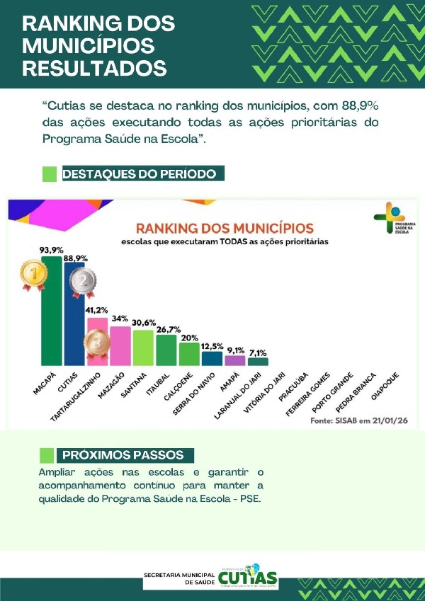 O município de Cutias do Araguari conquistou um importante destaque no Ranking dos Municípios que executaram as ações prioritárias do Programa Saúde na Escola (PSE), alcançando 88,9% de execução das ações previstas. O resultado posiciona o município entre os melhores desempenhos do período avaliado.